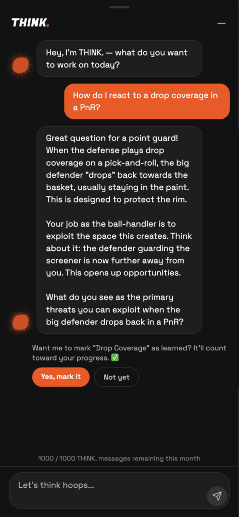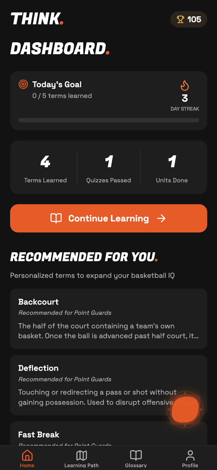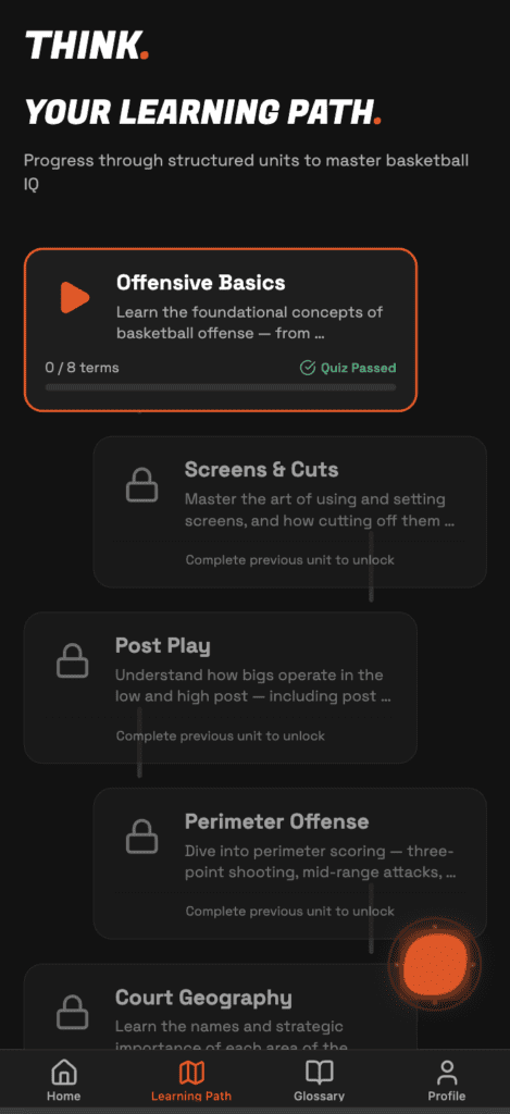 Whether you’re stepping on the court for the first time or playing professionally, THINK. meets you where you are. Our AI assessment creates personalized learning paths that eliminate knowledge gaps without overwhelming beginners or boring veterans.